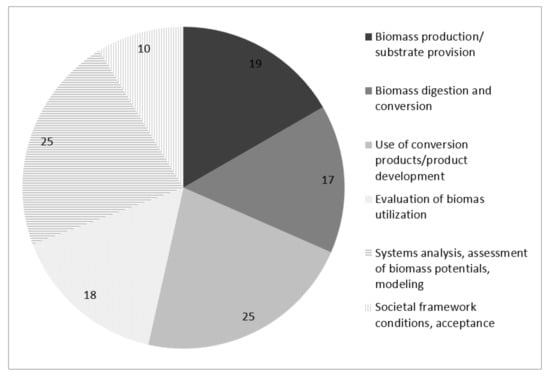 The scientists were asked about which field of activity their project could be assigned to. Multiple answers were possible. According to the responses, the majority (53%) related their projects to biomass production, conversion, and product development. The remaining 47% were assigned to evaluation, systems analysis, and societal framework conditions (Figure 1). Some respondents gave multiple answers, which indicated that their projects deal with different technical or different assessment aspects at the same time or even combine technical and nontechnical research areas such as sustainability assessment. In the biogas cluster, the share of assessment-related research activities was highest, with 58% of the responses. In the microalgae cluster, it was lowest, with 30%. This can be explained by the different development stages of the fields. While the biogas sector is well elaborated from a technical point of view and challenges arise from the lack of competitiveness and acceptance by local residents, microalgae production and conversion is a rather new approach that requires further technical research, with the consequence that an assessment of environmental and societal issues fades into the background.