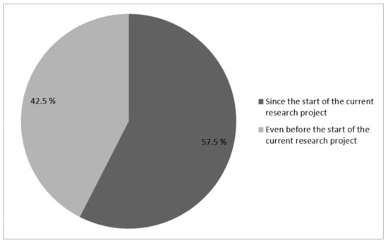 In answering the question of how long the scientists have been active in the field of bioeconomy, 43% of the respondents stated that they had already done research on bioeconomy before starting the research project with the Bioeconomy Research Program Baden-Württemberg. Fifty-seven percent entered the field at the start of the project (Figure 3). In the biogas network, more than half of the researchers had previous experience in bioeconomy research, and the majority of respondents in the lignocellulose group (59%) first came into contact with the topic through the current project. In the microalgae network, this share was even higher, at 67%. These differences can be explained by the fact that Baden-Württemberg has been seen as a pioneer in biogas research and implementation since the 1980s, while biotechnology-driven microalgae and lignocellulose research are quite new fields. Overall, the answers reflected the mixed composition of the project teams, which consist of professors or project managers with many years of experience in the field of bioeconomy and doctoral candidates who have recently entered the subject.