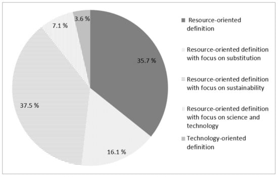 Almost all of the definitions (89%) saw the production and use of biogenic resources as core elements of the bioeconomy (resource-oriented definition, see Figure 4). Thirty-six percent of the definitions were related to the resource-oriented understanding, and 37% went beyond the pure resource orientation and outlined that biomass use should also meet environmental and social sustainability criteria (sustainability focus). Sixteen percent of the definitions emphasized the substitution of fossil resources with renewable feedstock (substitution focus). Only 7% of the definitions stressed the importance of science and technology in the context of a resource-oriented understanding (science and technology focus). Besides these resource-oriented understandings, 4% of the definitions concentrated on the use of innovative technologies for biomass conversion (technology-oriented definition). While the resource-oriented definition played an important role in all research clusters, the science and technology focus was most supported by respondents from the lignocellulose cluster, and the technology-oriented definition appeared only in the microalgae cluster. Table 1 provides some examples of definitions for the five categories.