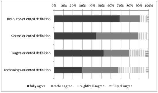 Overall, all types of definitions originating from official bioeconomy strategies were supported by the majority of respondents (Figure 5). However, the highest level of full agreement (over 60%) was recorded for the resource-oriented definition, followed by the target-oriented definition. This was in line with the results of the respondents’ own definitions, where the majority of definitions were solely resource-oriented or had an additional focus on sustainability. The sector-oriented definition showed a lower level of full agreement. Nevertheless, summing up the answers “fully agree” and “rather agree”, the sector-oriented definition received the highest agreement, together with the resource-oriented definition. The lowest level of full agreement was achieved for the technology-oriented definition. The proportion of people slightly disagreeing with this definition was highest, about 30%. The comparison to the researchers’ own definitions showed that the given technology-oriented definition received more support than a similar understanding formulated by the respondents themselves.
