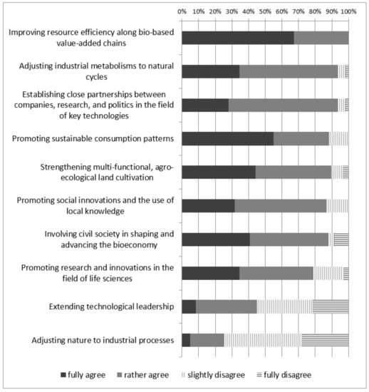With regard to sustainable development, the current EU bioeconomy policy is seen to lean strongly toward weak sustainability and to favor economic dimensions and concerns over environmental and social dimensions [32]. In addition, current developments in bioeconomy sectors adhere largely to the principles of weak sustainability [33]. The respondents’ strong support for some elements of the socio-ecological approach in the survey can be interpreted as the scientists’ recognition of the need for strong sustainability in the bioeconomy.