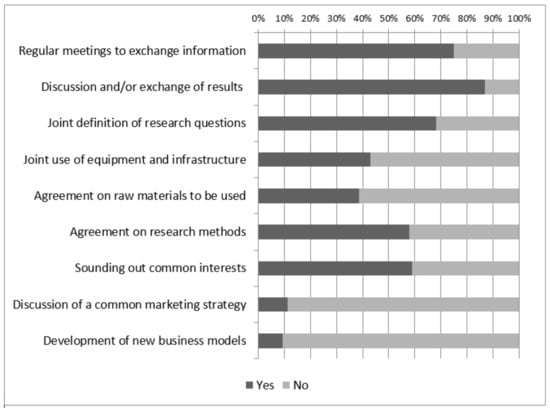 Moreover, the scientists were asked to classify their networking activities according to forms of cooperation (Figure 10). The responses showed that traditional forms of scientific cooperation prevail, such as the exchange of information and results, joint definitions of research questions, agreement on methods, joint use of equipment, and agreement on raw materials. The majority of respondents indicated that their collaborations aim to sound out common interests, and only a marginal proportion is involved in collaborations aimed at discussing marketing strategies and developing new business models.