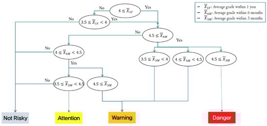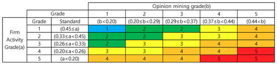 Figure 2. Grades are then classified into danger, warning, or attention signals. The total risk grade is evaluated from two perspectives: the firm activity grade and the opinion mining grade, derived in total from grades 1 to 5. For example, if the firm activity grade is more than 0.45, and the opinion mining grade is less than 0.20, then the total risk grade is ranked #1, with the lowest risk value. In contrast, if the firm activity grade is less than 0.20, and the opinion mining grade is more than 0.44, the total risk grade is selected as the highest risk grade of 5. The criteria used for distinguishing these risk signals are shown in