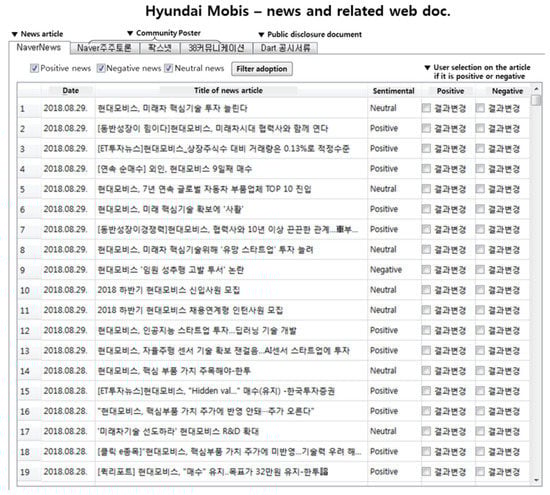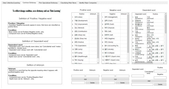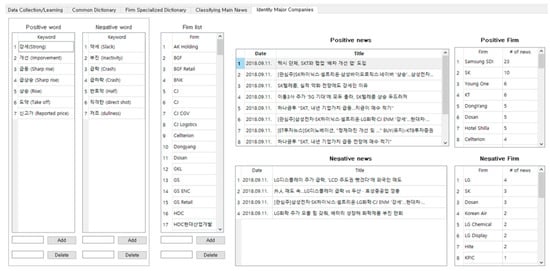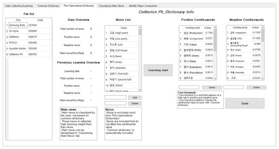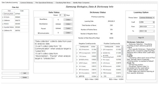Figure 8. The period of data to be learned is then set. The cut-off value that distinguishes between positive and negative news is set, and learning is conducted for company data. It is possible to increase the accuracy of the data by determining the positive or negative values of words by using the dictionary function or by adding the company’s core keyword as shown in