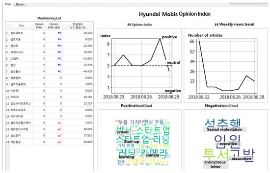 Figure 6. It provides opinion mining scores along with the daily news increase and decrease for all observed companies that the user has registered in advance. In addition, the main interface provides weekly positive and negative changes in the opinion index and news counts, which can be visualized in a word cloud, to visualize which core keywords appear in positive news and negative news.