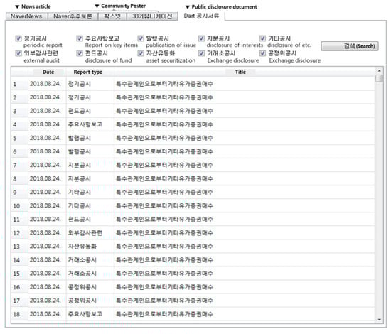 The process of collecting data begins by collecting new news, community comments, and dart announcements on a daily basis. When the program is executed, data collection starts automatically for the analysis of the target companies entered in advance. These collected data are presented in the UI (User Interface) as shown in