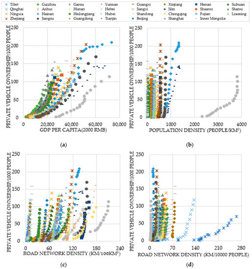 In China, there are many socioeconomic factors that affect private vehicle ownership, and they can be grouped into three categories: (1) policy factors, such as private vehicle development policy and local transportation policy; (2) social factors, such as urban planning, population density, and road network density; and (3) economic factors, such as per capita GDP, income level, and vehicle price. On the basis of the above analysis, the panel data of China’s provinces in the past 20 years were chosen to explore the relationship between vehicle ownership and per capita GDP, population density, and road network density. Figure 2 shows that the curves for the provinces generally conform to the S-shaped curve. In the areas lacking restrictions on vehicle purchasing, despite provincial differences, there was a strong positive correlation between the number of private vehicles owned per 1000 people and per capita GDP. In most areas, compared with GDP per capita, population density and road network density had no significant impact on the private vehicle ownership per 1000 people. In the areas affected by limited purchasing, such as Shanghai, Beijing, and Tianjin, the number of private vehicles owned per 1000 people was lower for a similar per capita GDP. However, it is worth noting that China’s purchase restriction policy has different effects on the vehicle market because their implementation objectives, implementation time, and policy content all differ. For example, since 2018, Hainan Province has become China’s ninth area to restrict automobile purchasing, but its vehicle ownership is low. The intent of the purchase restriction is not to limit the purchase volume but to prioritize environmental protection and encourage the purchase of new-energy vehicles [26]. Therefore, it can be predicted that its purchase restriction policy has little impact on vehicle ownership. This result is in line with previous studies, which have frequently concluded that many variables affect the actual vehicle ownership rate, but in China, per capita GDP explains most of the changes in the vehicle ownership rate [27]. Therefore, this paper forecasts the development trend of China’s private vehicle ownership in the future using the development law of vehicle ownership in developed countries and the status quo of private vehicle ownership in China’s provinces.