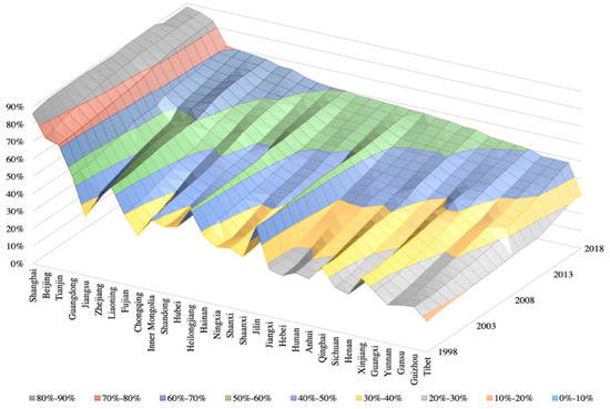 With its fast pace of economic development, China’s urbanization process has developed rapidly. According to the data released by the National Bureau of Statistics, the urbanization rate of permanent residents in China reached 59.6% at the end of 2018, and the urbanization rate of the household registered population was 43.37%. The urbanization rate of permanent residents in 2018 was close to the target set for 2020. At the end of 2018, Shanghai, Beijing, and Tianjin had the highest urbanization levels of over 80%; the urbanization rate of Guangdong, Jiangsu, Zhejiang, Liaoning, and other eastern regions was around 70%; and the urban population of Yunnan, Gansu, Guizhou, and Tibet was less than 50% but higher than 30%. Figure 3 shows the urbanization level of 31 Chinese provinces during the period 1998–2018.