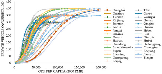 As stated in its governmental plan, China aims to reach the per capita income level of the middle-income group of developed countries. According to data released by the National Bureau of Statistics of China on 21 January 2019, China’s GDP in 2018 was 90.0309 trillion yuan. Conversion at an average exchange rate results in a total economic output of 13.6 trillion US dollars. With a population of 139.538 million in mainland China at the end of 2018, the per capita GDP was close to 10,000 US dollars. The World Bank’s 2015 standards [30] indicate that the per capita GDP of low-income countries was less than $1045, that of lower-middle-income countries was between $1045 and $4125, that of upper-middle-income countries was between $4126 and $12,735, and that of high-income countries was above $12,736. According to estimates, China’s per capita GDP in 2018 was about 9780 US dollars, which is already at a high level in upper-middle-income countries. Therefore, it is foreseeable that if China continues to maintain a growth rate of 6%, it will reach the level of the World Bank’s high-income country by 2023. However, the economic development in Chinese provinces is uneven, and the pace of urbanization is different. Analyzing the consumption of durable goods such as vehicles reveals that, although the retention rate of private vehicles in most provinces increases with the growth of per capita income, the growth trend in each province is not the same. This paper analyzes and predicts the duration of this rapid growth trend and future private vehicle ownership.
