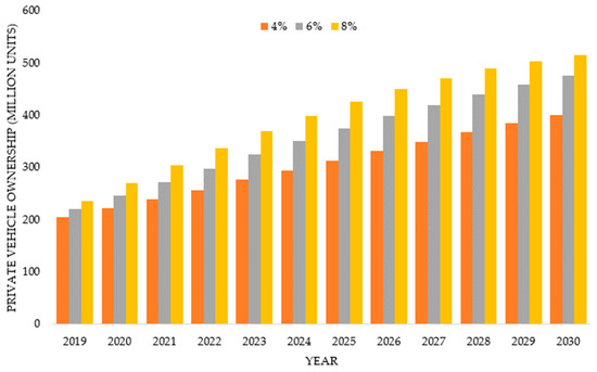 From the above analysis, we can predict the private vehicle ownership in China. The results are shown in Figure 6. As an example, with the mid-growth scenario, China’s private vehicle ownership will reach 246 million, 375 million, and 475 million in 2020, 2025, and 2030, respectively, indicating that China’s motorization process will expand significantly. Energy consumption, exhaust emissions, traffic pressure, scrapped vehicle recycling, and other problems will become increasingly prominent.