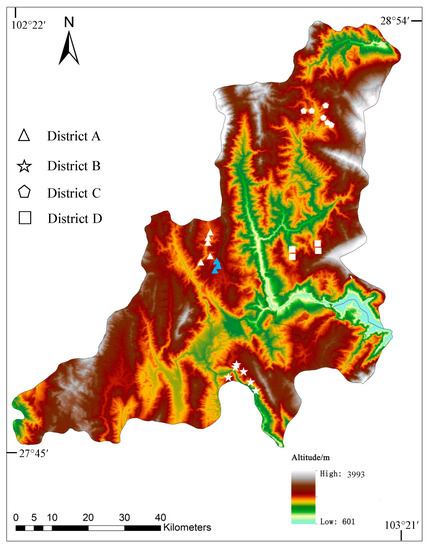 The Liangshan Yi Autonomous Prefecture is located in the upper Yangtze River watershed of southwest Sichuan Province, near the Hengduan Mountains. It is the largest community of Yi people in China, with a population of 2.64 million. The community has a long and rich folk culture. For several reasons, Liangshan is a poverty-stricken area, and has been designated as an important region for poverty reduction by Chinese authorities. Study sites were selected from Zhaojue and Meigu counties of Liangshan (Figure 1). Four districts were identified based on their importance in Tartary buckwheat production and consumption; all of the districts were located at an altitude of greater than 2050 m (Table 1 and Figure 1). Four to six villages were selected based on their resources for cultivating Tartary buckwheat, giving a total of 21 villages across all four districts. In addition, three villages were selected from District A for an additional case study (Figure 1). Some background of the study sites is provided in Table 1.