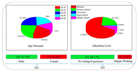 We conducted fieldwork in 2017 and 2018 to investigate Tartary buckwheat landraces and seed exchange networks. Approximately ten households per village were surveyed (Table 1 and Figure 1) via participatory rural appraisal (PRA) using key informant interviews and semi-structured interviews [33,34,35,36]. As mentioned above, three of the villages (22, 23, and 24; Table 1 and Figure 1) from District A were selected for a case study, for the purpose of analyzing network centrality data. During this case study, we lived and worked with the local farmers to learn their customs, indigenous knowledge, and seed exchange networks. In total, including the case study, we surveyed 242 households (Figure 2) across the 24 villages.
