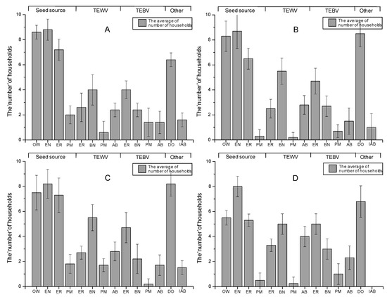 Tartary buckwheat seed sources. The figure shows seed source, type of exchange within village (TEWV), and type of exchange outside village (TEBV). OW—saving-self; EN—exchanging with neighbors; ER—exchanging with relatives; PM—purchasing from market; DO—marriage dowry; IAB—issued by agricultural bureau. A, B, C and D represent four different districts.