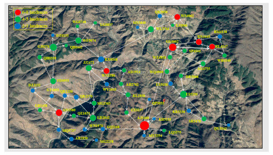 Network map. It shows the Tartary buckwheat seed flow between three villages in Zhaojue County (55 households). The color of the nodes indicates the number of Tartary buckwheat landraces retained by households, the size of the nodes is an indication for the degree of the households, arrows indicate the direction of the seed flow, and the location of the nodes is the actual location of households. Lastly, the network is not closed.