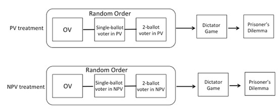 We adopt the strategy method to collect meaningful data for this study as much as possible. Thus, before determining the voting scheme (OV or PV/NPV) and the role (present generation or future generation; OV voter, single-ballot voter, or two-ballot voter), the participants are asked to choose and vote for either Choice A or B if they play each of the roles. In the PV and NPV treatments, there are three roles (i.e., OV voter, single-ballot voter in the PV/NPV scheme, and two-ballot voter in the PV/NPV scheme) of making decisions; thus, the three decisions are made in a random order to control the order effect (see Figure 1). Before each decision, we give three minutes to the participants for considering the decision.