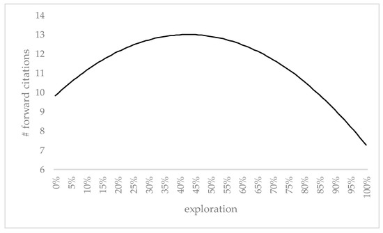 Table 2 shows the results of regression of the number of forward citations with respect to exploration. Results show that the linear coefficient was positive, whereas the quadratic one was negative, suggesting an inverted U-shape trend. Given that exploitation was defined as 1 − exploration, the result suggests that a balanced mix of exploration and exploitation provides higher technological quality than a pure exploration or a pure exploitation strategy.