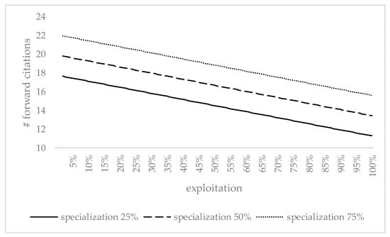 Number of forward citations trend with respect to exploitation with different levels of specialization.