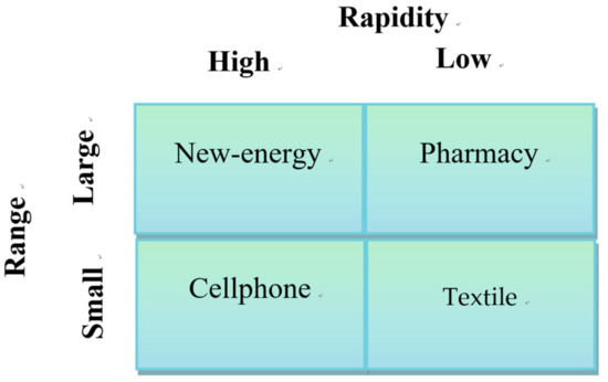 We argue that the essence of environmental (both market and technology) turbulence’s effect on the firm is that it makes firm’s knowledge (including technology) evolve [46,48,49]. In other words, because of the environmental turbulence, the value of the same technology may increase or decrease with time. Consequently, the contribution of technology to innovation performance fluctuates. We define environmental turbulence as the rapidity and range of the market and technological changes that would vary the value of firm knowledge (including technology) [50]. Rapidity and range of environmental turbulence are two key factors determined by industry features, stage of the industry life cycle, and technology evolution. We take four industries as an example to differentiate better the range and rapidity. Figure 1 shows that new energy is a novel industry with high turbulent rapidity and range, while textile is a mature one with low rapidity and range. As for the pharmacy industry, it remains relevantly stable and does not change very frequently. However, whenever a change occurs in the pharmacy industry, it must be a radical one, which is why pharmacy is located in the upper right corner. In contrast, the cellphone industry [42] is fast-paced, evolves rapidly, and does not undergo a radical change.