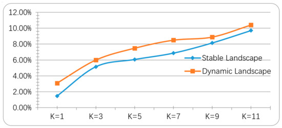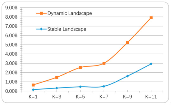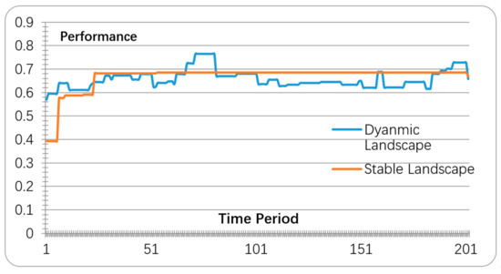 Two main differences can be observed between our dynamic landscape simulation and prior stable one. In the stable one, the overall value of technology would never diminish but could increase and decrease in the dynamic one. Obviously, the later one could better simulate the real world because no value of technology continues upwards all the time. There is also no need for a fixed optimal peak in the dynamic one because the landscape fluctuates with time. Hence, we will measure the average performance of all time periods to compare the result, instead of the last performance in the stable one [18,51]. Figure 2 shows that in a stable landscape, performance rises and remains steady one it reaches the optimal peak, while in our dynamic landscape, performance fluctuates.