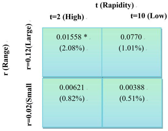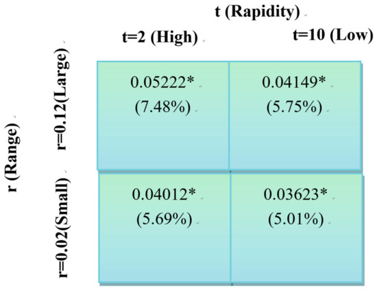 Figure 5 and Figure 6 show that the advantage percentage becomes larger as the turbulent rapidity or range increases. The advantage percentage was the largest in a situation with high rapidity and large range (7.48% and 2.08%), and least in a situation with low rapidity and small range (5.01%, 0.51%). The results shown in the two matrices above confirm that both turbulent rapidity and range make the enlargement of technology innovation scope more valuable. Turbulent rapidity and range had positive effects on the relationship between innovation search scope and innovation performance.