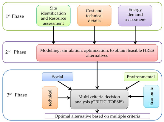 The second stage involves the use of HOMER to simulate and optimize the HRES alternatives. The selection and ranking of HRES at this stage is based on the total net present cost (TNPC). The last stage uses multi-criteria decision-making (MCDM) approach to rank the HRES alternatives based on multiple criteria (social, technical, economic, environmental, and policy).