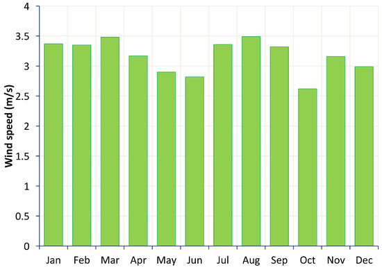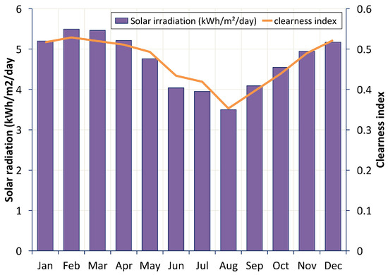The average 22 year solar radiation and wind speed data for the location considered in this study was obtained from the NASA website [43] (Figure 3 and Figure 4).