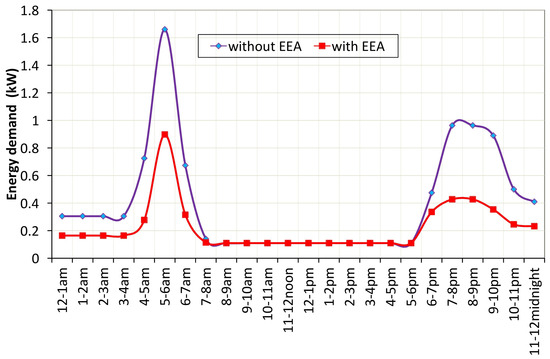 The number of occupants varies between one and four. The energy demand profile of a typical low-income household (in Nigeria) is presented in Figure 6. In order to elucidate the advantage of energy efficient energy-consuming home gadgets, this study considered two load scenarios: energy demand without energy efficient energy-consuming devices and energy demand with energy efficient energy-consuming devices. It is assumed that a capital cost of $2000 would be incurred for the retrofit of inefficient energy gadgets- the replaced gadgets are lighting bulbs, ceiling fans, television, and pressing iron. The hourly energy consumption is estimated using Equation (4). Table 2 shows the gadget, power rating, energy consumption, and daily duration of consumption for both scenarios mentioned above. Without retrofitting, it is observed that lighting consumes the highest energy (36%) while equipment such as blender, phone, television and cable decoder consumes the least energy. After retrofit, the lighting consumes only 10% of the total energy while the refrigeration consumes the highest (Figure 7). The demand profile shows that the peak periods of the energy demand occur around 5 a.m. and 6 a.m. as well as 7 p.m. and 10 p.m. The first peak is associated with preparation for daily work by residents while the second peak can be attributed to the resident retiring from their daily work and make use of electricity for various domestic needs. Since residents are not usually around between 7 a.m. and 6 p.m., the energy consumption is minimal.