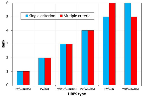 Results from the multi-criteria decision making analysis indicates that PV/GEN/BAT with a relative closeness of 0.734 is the most suitable HRES. This is the same HRES alternative that is identified as the optimal based on single criterion of TNPC. The second best system is PV/BAT energy system, with a relative closeness of 0.654; this is followed by PV/WD/GEN/BAT, with a relative closeness of 0.637. The fourth ranked HRES is the PV/WD/BAT HRES, with a relative closeness of 0.605. In the fifth place is WD/GEN/BAT system, with a relative closeness of 0.493 while the PV/GEN energy system, with a relative closeness of 0.302 is ranked worst. A comparison between the system ranking with a single criterion and with multiple criteria is presented in Figure 9. Except for the last two systems on the list returned by the TOPSIS method, all other systems produced the same ranking when compared with the ranking returned by HOMER (single criterion).