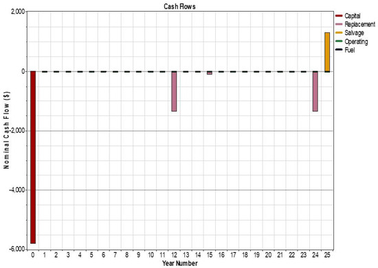 The cash flow details for the most suitable HRES based on multi-criteria decision analysis is presented in Figure 10. The initial investment cost of putting up the system is $5807. The initial cost of this project consists of the purchase price of the various components which make up the system; its breakdown shows that the PV panels accounts for about 38.7% ($2250) of the capital cost. This is followed by cost of energy efficiency activities-$2,000; battery bank-$1320; gasoline generator-$154 and converter-$ 83. The battery bank will be replaced two times during the project lifespan (year 12 and year 24). However, the entire system can be sold for $1294.7 (salvage) at the end of the project life span of 25 years.