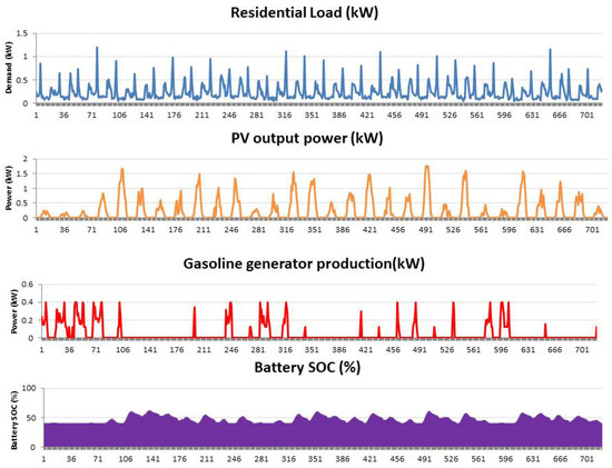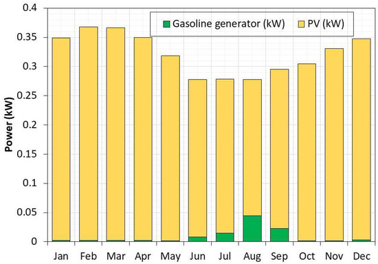 Gasoline generator: A 2.6 kW generator with a capital cost of $1000 is specified. The software then interpolates or extrapolates this value to obtain the cost for the generator specified in the optimal system. The operation and maintenance cost of the generator is fixed as 0.04 $/h. The replacement cost of the gasoline generator is $1000 and its lifespan is 15,000 h. Other parameters specified for the generator include: minimum load ratio of 30%, intercept coefficient of 0.08 L/h/kW rated, and slope of 0.25 L/h/kW output. The search space considered include: 0.4, 0.5, 0.75 and 1 (kW), respectively.