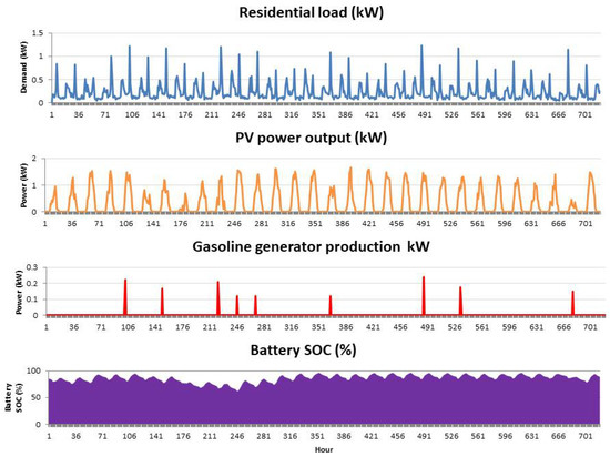 When EET is applied to the residential loads, the optimal HRES that will meet the energy demand of the residential apartment is also a PV-generator-battery system but with lower generator size and higher PV capacity. The rating of the components include: PV—2 kW, generator—0.4 kW, and 6 batteries. The initial investment (inclusive of equipment retrofits) for acquiring this system is $5807, while the TNPC and COE is $6919 and 0.28 $/kWh, respectively. The renewable fraction (RF) for this HRES is 97% with gasoline generator operating for only 367 h in a year while emitting 83.2 kg of annually. The other HRES alternatives returned with EET application (ranked based on TNPC) include PV/BAT with a TNPC of $7738 and RF of 100%; PV/WD/GEN/BAT with a TNPC and R.F of $11,087 and 95%, respectively; PV/WD/BAT with a TNPC and RF of $11,766 and 100%, respectively; PV/GEN with a TNPC and RF of $11,778 and 39% respectively; and WD/GEN/BAT with a TNPC and RF of $12,752 and 43% respectively. Out of these HRES alternatives, the PV/GEN/BAT (optimal system) has the least discounted payback period of slightly less than 5 years. If the gasoline generators presently used by many of the residents are replaced by the PV/GEN/BAT, this means that in less than 5 years, the initial capital cost spent in putting up the system will be recovered. Furthermore, the PV/GEN/BAT HRES performed better than the other alternatives with regards to present worth, annual worth, return on investment (ROI) and Internal rate of return (IRR). These are indicators of the superior economic feasibility and profitability features of the PV/GEN/BAT HRES.