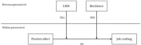 Resilience is a personality characteristic associated with psychological resources. Resilience is the ability to recover from negative situations or events [28]. It involves growing and developing while simultaneously overcoming challenges [8]. Therefore, those with low resilience are unable to control their job stress as effectively as those who are highly resilient [29]; when confronted with situations or events that can lead to stress, those with low resilience would saturate much quicker. For employees with high resilience, however, it serves as a significant internal resource. In the present study, similar to LMX, the job crafting of employees with low resilience is more significantly influenced by their daily positive affect. Taken together, we hypothesize the following cross-level interactions.
