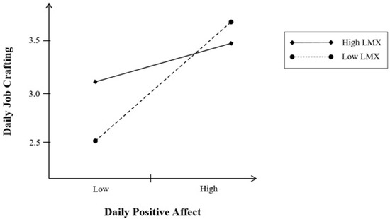 As mentioned, positive affect, represented by the happiness and joy of the employees occurring in the daily workplace, contributes to job crafting. When an individual routinely has few resources because of a low-level of LMX, their daily state which mean daily level of energy would be a strong impact on their job crafting. In this regard, we expect that the relationship between daily positive affect and daily job crafting will be stronger in employees with a lower level of LMX.