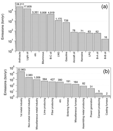Figure 3 shows the emissions of FPM2.5 by fuel for each air pollutant source in Korea in 2014 [25]. Anthracite coal was the largest contributor to emissions of FPM2.5, followed by diesel. Korea’s air pollutant emission sources are managed by the CAPSS. The CAPSS source classification system is based on the European Core Inventory of Air Emission (CORINAIR) source classification system (SNAP 97) and is divided into 13 major categories. Fuel combustion sources are divided into energy industry (01), non-industry (02), and manufacturing combustion (03). Emissions from manufacturing processes are divided into production process (04). Gasoline evaporation at gas stations and low-cost stations is included in energy transport and storage (05), and emissions from the use of paint including organic solvents represent (06). Automobiles are classified as non-road (08) sources for roads (07), aviation, ships, and construction machinery and include sources for waste treatment (09), as well as agricultural activities (10). Fires are classified as biogenic combustion (13) sources, such as fugitive pollutants (11), road rebuilding, construction activities, fugitive dusts (12), meat grills, and charcoal fireplaces [25]. According to Figure 3b, most of the anthracite coal use was by the primary metal manufacturing industry, and non-metallic mineral manufacturing occupied the second place by CAPSS fuel source. According to Figure 3c, most of the diesel consumption in CAPSS fuel sources was by road and non-road transport sources.