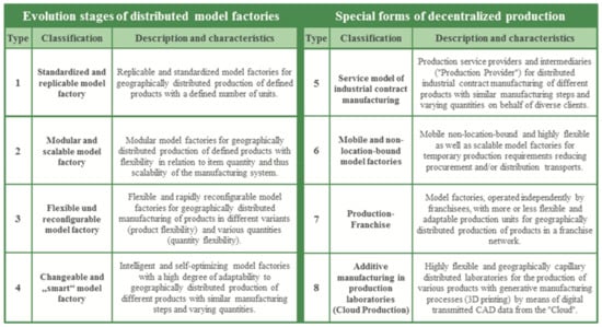 - Matt, D.; Rauch, E.; Dallasega, P. Trends towards Distributed Manufacturing Systems and Modern Forms for their Design. Procedia CIRP 2015, 33, 185–190, Figure 1 Reprinted from this journal with permission from Elsevier. [Google Scholar] [CrossRef]
