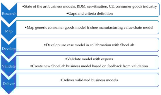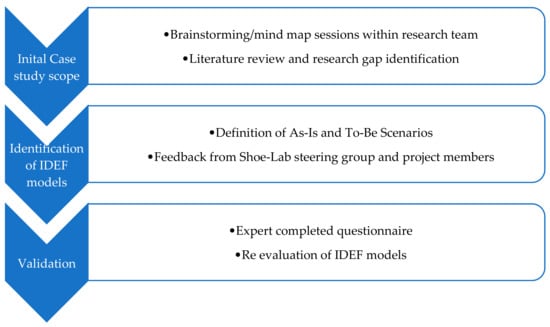 The IDEF0 (Icam DEFinition for Function Modelling) modelling standard is one of the most popular graphical notations for business systems and process planning [30,31]. IDEF0 could provide a clear picture of how value can be created and then transferred through the help of different functions and resources during the implementation of a distributed and circular business model. Such a model requires a systemic perspective in order to connect and deliver value to the region where it should integrate in order to be meaningful and provide value as expected [30]. This study followed a linear development path involving the establishment of the state-of-the-art through value chain mapping in the consumer goods industry to the development of a business model for sustainable RdM based on a case study (shown in Figure 2). A generalized manufacturing value chain serves as a foundation for all of the models as they follow a procure, produce, retail, consume, and dispose flow of functions as a structure/initial blueprint. The case study as a methodological tool for intensive investigation into one research case instance is now well established [32]. The case study development process, shown in Figure 3, involved three broad stages: brainstorming within the team for development of initial scenario areas, literature review and research gap identification, development of As-Is and To-Be scenarios, feedback on initial scenarios from ShoeLab internal and steering groups, validation of completed Integration Definition for Function Modelling (IDEF) model scenarios by experts, and re-evaluation of case study models. The main procedures for the development of the models were followed according to Integration Definition for Function Modelling (IDEF) [33] model creation methodology.