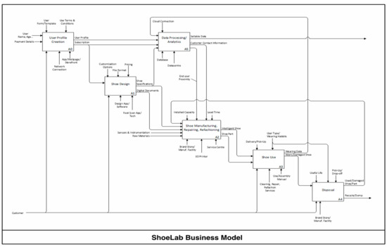 The ShoeLab business model starts with the User Profile Creation (A0, Figure 5) function. During this function, the customer provides their general information as input (name, age) and details regarding their preferred payment method. The resources are the tools that the customer will need in order to input their information, mostly a Network Connection and the Application, which could be in a mobile device app, web app, or in the actual storefront. This function provides the customer information including their subscription and product preferences as output. This output and other information related outputs are centralized in a Data Processing/Analytics function (A5, Figure 5). The main use of the information provided by A0 is to activate the Shoe Design function (A1, Figure 5) so that the customer can provide personal preferences in the form of customisation options for the product. Based on these choices, pricing is determined, and in the background, data is captured and transformed to a format suitable for the 3D printing machine to be able to process. The resources are in the form of applications to help the customer scan their foot dimensions and additional technology to carry this out if the customer is in store. The main outputs from this function are in the form of shoe specifications and digital documents. Both are, in essence, the same information being transferred in different formats and for different purposes. The shoe specifications provided by the customer are stored in the Data Processing/Analytics function and this same information but in a 3D printer readable format is provided as a digital document to the following function of Shoe Manufacturing, Repairing, and Refurbishing (A2, Figure 5).
