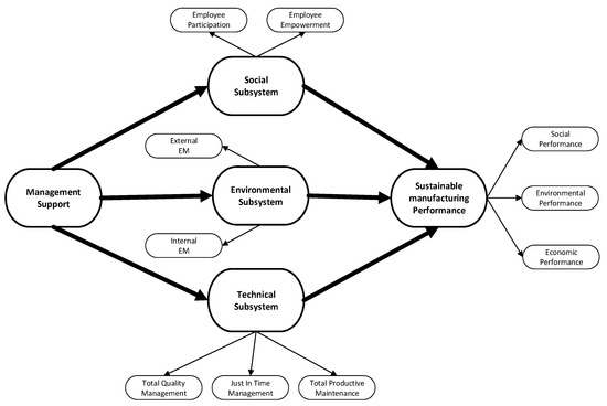 The work design in manufacturing identified a broader range of work practices under social, technical, and environmental subsystems [16]. However, the effectiveness of these work practices is dependent on management support at all levels of the manufacturing process [22], which is the essential part of the theoretical model of this study. There is already some evidence of the positive impact of management support on social interventions among the employees [23]. Management can play an important role by empowering employees to enhance belief and confidence among employees in pursuing sustainable manufacturing practices [24]. Raja [7] and Maynard et al. [25] confirmed that management support is vital for pursuing the social element in manufacturing processes effectively. The relationship between management support and financial performance has already been established, but it is still unexplored whether there is any relationship between the top management support and the social and environmental aspect of the manufacturing performance. Thus, little is known about whether management support has any influence on the social, environmental, and economic performance. The relationship between management support and sustainable manufacturing performance remains unexplored. Following the above problematization, we develop the following hypothesis for testing: