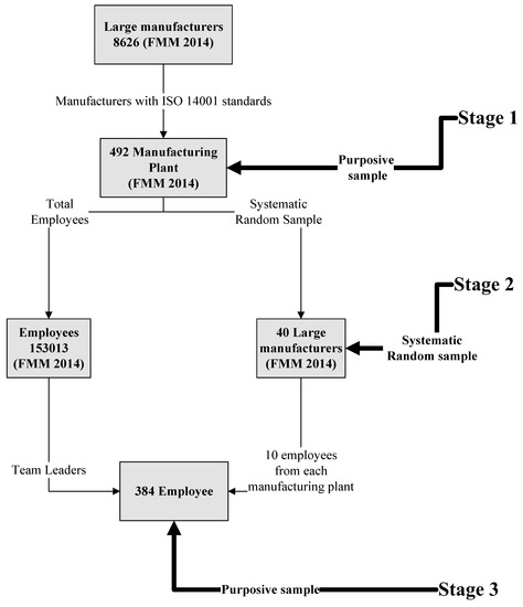The sampling frame was drawn from the ‘Directory of Federation of Malaysian Manufacturers’ (FMM Directory, 2014) [47], which carries all manufacturers in Malaysia registered with the Federation of Malaysian Manufacturers (FMM). Some initial information about the firms, such as number of employees, annual sales, websites, countries to where firms export their products, and firms’ locations, are accessible through this directory. Respondents included floor, manufacturing, and production supervisors with team leaders. We used Krejcie and Morgan [48] criteria for calculating our sample size from the population of managerial employees from 8626 manufacturing plants. We used multistage sampling procedure to collect data from a sample of 384. In the first stage, we identified the manufacturing industries with ISO 14001 certification. We identified 492 large manufacturing industries having ISO 14001 certification. The second stage was to identify samples of 40 large manufacturing industries using systematic sampling technique. According to FMM [47], 153,013 managerial-level employees are working in large manufacturing firms in Malaysia. Respondents in our sample size came to 384 [49]. Figure 2 explains the multistage sampling procedure carried out for the current study.