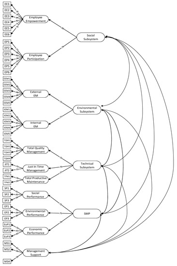 Table 3 presents the results of principal component analysis (PCA). The latent construct of work practices in the social subsystems were factorized into two components. The first and second components of social subsystems indicated 36.4% and 32.2% of common variance, respectively, with a cumulative variance of 68.6%. The first and second components of work practices in the environmental subsystems showed a common variation of 43.7% and 31.3%, respectively, so that its cumulative common variation came to 75.0%. The third section consisted of technical subsystems with three components: the common variations of TQM, TPM, and JIT were 38.6%, 18.1%, and 10.1%, respectively, with a cumulative common variation of 67.6%. The three components of sustainable manufacturing performance had common variations of 21.6%, 16.6%, and 16.0%, respectively, with a cumulative common variation of 54.2%.