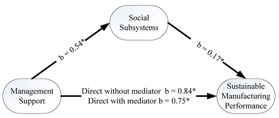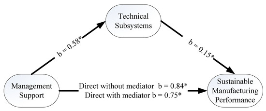 Figure 6 shows the path coefficient of 0.75 between management support and sustainable manufacturing after including technical subsystems, which is statistically highly significant. Hence, management support shows a significant direct impact on sustainable manufacturing performance. Indirect path coefficient of 0.087 through technical subsystems is also highly significant so that hypothesis is accepted. Technical subsystems mediate the association between management support and sustainable manufacturing performance. As shown in Table 7, since the direct effects of management support on sustainable manufacturing performance are also significant upon calculation with mediator, the mediation is partial as suggested by Baron and Kenny [21].