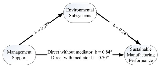 Figure 5 shows the path coefficient of 0.70 between management support and sustainable manufacturing after including environmental subsystems, which is highly significant. Thus, management support shows a significant direct impact on sustainable manufacturing performance. Table 6 shows the indirect path coefficient of 0.139 for management support through environmental subsystems to sustainable manufacturing performance. Bootstrapping analysis with 1000 iterations was performed to get p-values of the indirect path, which is lower than 0.05. Hypothesis 3 is accepted. Thus, environmental subsystems mediate the association between management support and sustainable manufacturing performance. Since the direct effects of management support on sustainable manufacturing performance are also significant, the mediation is partial as suggested by Baron and Kenny [21]. Table 7 presents the mediation results.