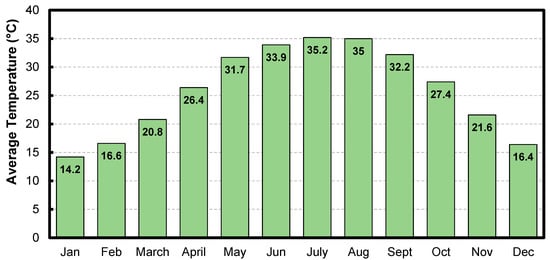 We provide in Figure 1 the average monthly solar irradiation levels in Riyadh. As expected, solar irradiation levels increase during the summer months given the longer days. The average irradiation for Riyadh is around 5.8 kWh/m2/day. In Figure 2, the average temperatures in Riyadh are provided. Both the irradiation and temperature levels are important parameters that significantly affect the output of solar PV systems as will be discussed.
