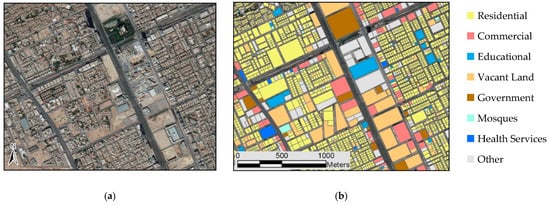 A sample of the geographical data available for a neighborhood in Northern Riyadh. (a) This figure shows the neighborhood as it appears in satellite imagery using ArcGIS base-map. (b) The same figure that is in (a) but categorized as land parcels, and each land parcel is color-coded based on its zonal designation. For example, yellow parcels represent residential land lots, while a light-blue parcel represents a lot that is designated as an educational institution.