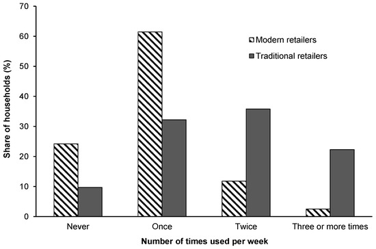 Figure 1 shows that the average frequency of traditional retailer use is higher than that of modern retailer use. Many households make one larger purchase in a supermarket or hypermarket once a week and then purchase additional foods from traditional retailers whenever needed during the week.