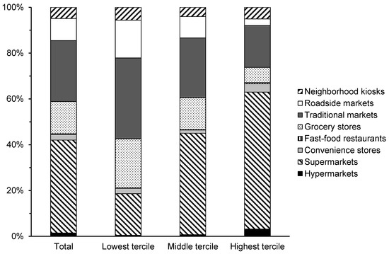 Figure 2 shows the distribution of household food expenditure shares by type of retailer. For the sample as a whole, 42% of the food expenditures are made for purchases from modern retailers. This is very high when compared to most other African countries, even when only looking at urban areas [7]. The rest of the household food budgets are spent (58%) in traditional retail outlets. Notable differences are observed between the three income terciles. While households in the highest tercile make 63% of their food expenditures in modern retailers, for households in the lowest tercile this share is only around 20%. This is in line with [25,37] who found that poor households use modern retailers less extensively than rich households in Kenya and Vietnam, respectively. Among the modern retailers, supermarkets account for the lion’s share of food expenditures for all households in Lusaka.