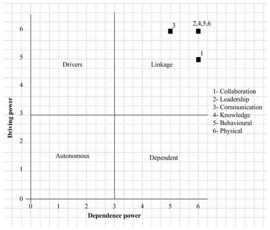 Table 7 presents the final RM. As there is no transitivity, the RM matrix and final RM will be the same. Table 6 has been represented to show the calculation of driving and dependence power as an important step of the ISM method. Hence, it has been re-named as Table 7 because it includes this calculation. The driving power of an organisational factor is the total number of factors, including itself, that it may influence. The dependence power is the total number of factors that may help in alleviating it. Based on the driving and dependence power, the organisational factor can be classified into four clusters: autonomous, dependent, linkage, and independent/driver barriers. This classification and its implications are explained in more detail in the next section.