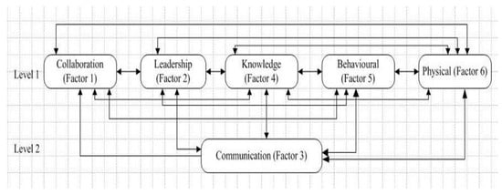 From Table 6, all factors but communications were found at level one. Therefore, they will be positioned at the top-level of the ISM hierarchy. The final ISM model for organisational factors is shown in Figure 2 below. The arrow direction indicates the relationship between the different factors. For example, the relationship between collaboration and leadership factors was a two-way relationship. Therefore, an arrow pointing in both directions was used to denote this relationship. Conversely, the relationship between communication and collaboration factors only occurred in one direction, in which the former could influence the latter. Therefore, an arrow pointing from the communication to collaboration factor was used.