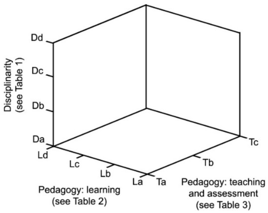 A three-dimensional pedagogic space defined by two pedagogic (x- and y-) axes and disciplinarity.