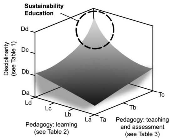 Having defined a ‘pedagogic space’, how are learning objectives and outcomes situated within it? We need to visualize how the three axes constrain how learning takes place and where particular forms of learning are situated. We suggest that didactic teaching and assessment (Ta: Table 3) and passive learning (La: Table 2) would be unlikely to allow learning beyond a single discipline. Conversely, learning at cross-disciplinary and transdisciplinary levels would require active and reflective learning (Lc, Ld: Table 2) and teaching and assessment that supports this as a collaborative activity (Tc: Table 3). We expect that, for a given level of teaching and assessment, increasingly active and experiential learning will allow learners to progress cumulatively along the disciplinarity axis. Similarly, for a given level of learning, more facilitative teaching and assessment will also allow learners to address more complex issues further along the disciplinarity axis. We represent this relationship by a surface within the pedagogic space defined by the three axes (Figure 2). Sustainability education occupies the part of the space where transdisciplinary learning is supported. This implies that curriculum design needs to adopt pedagogic approaches that facilitate learners to reach and occupy that space.